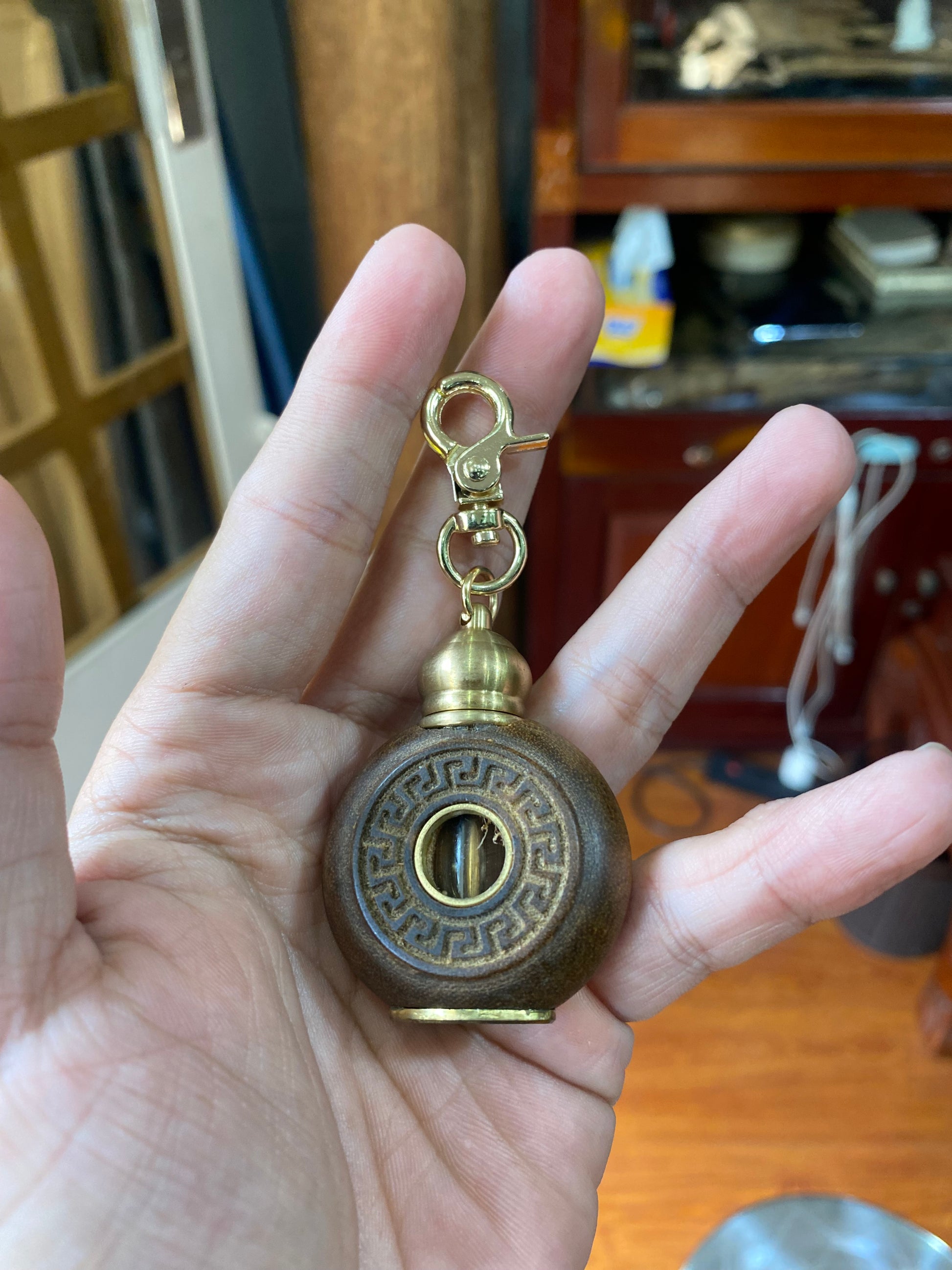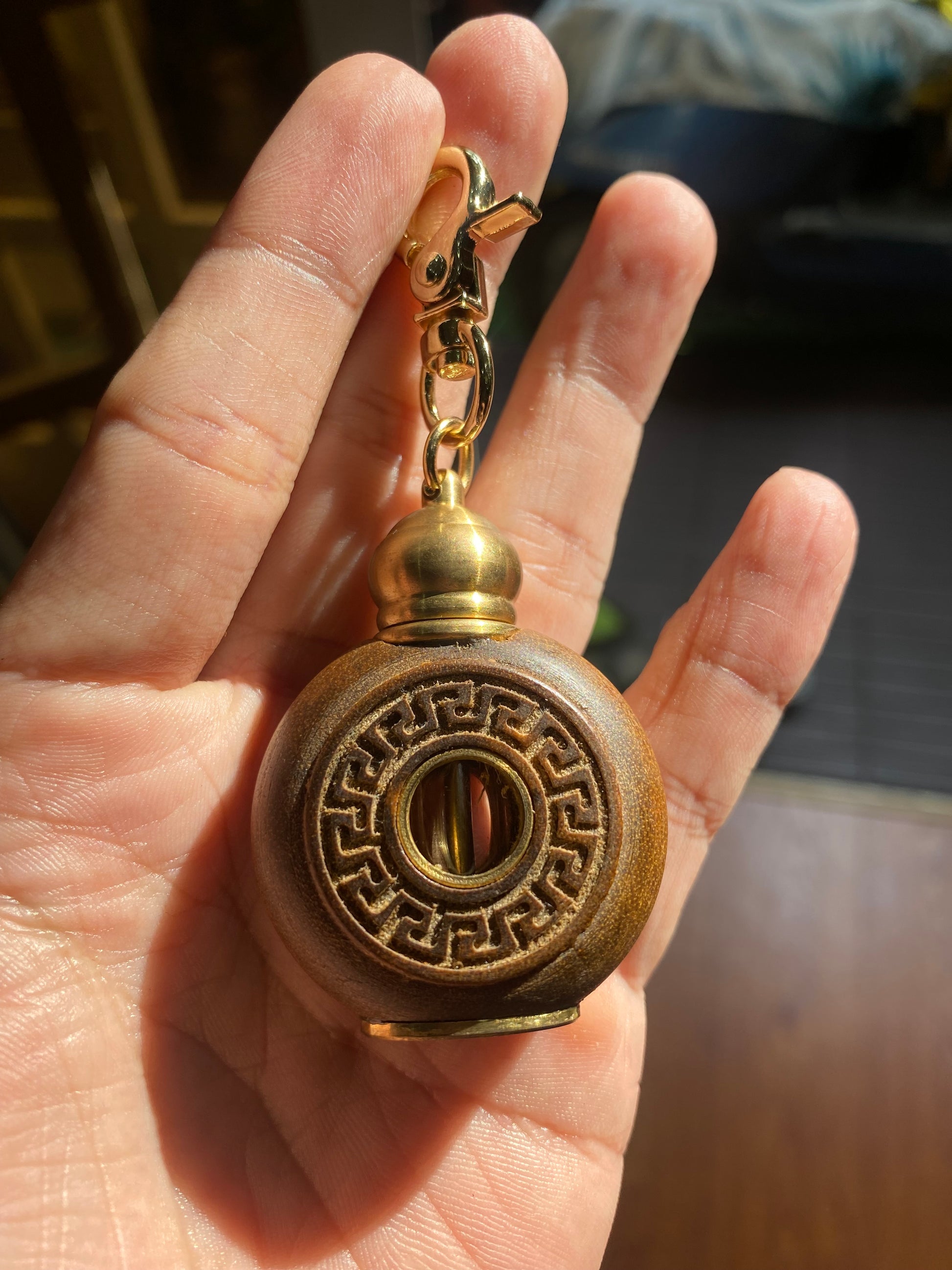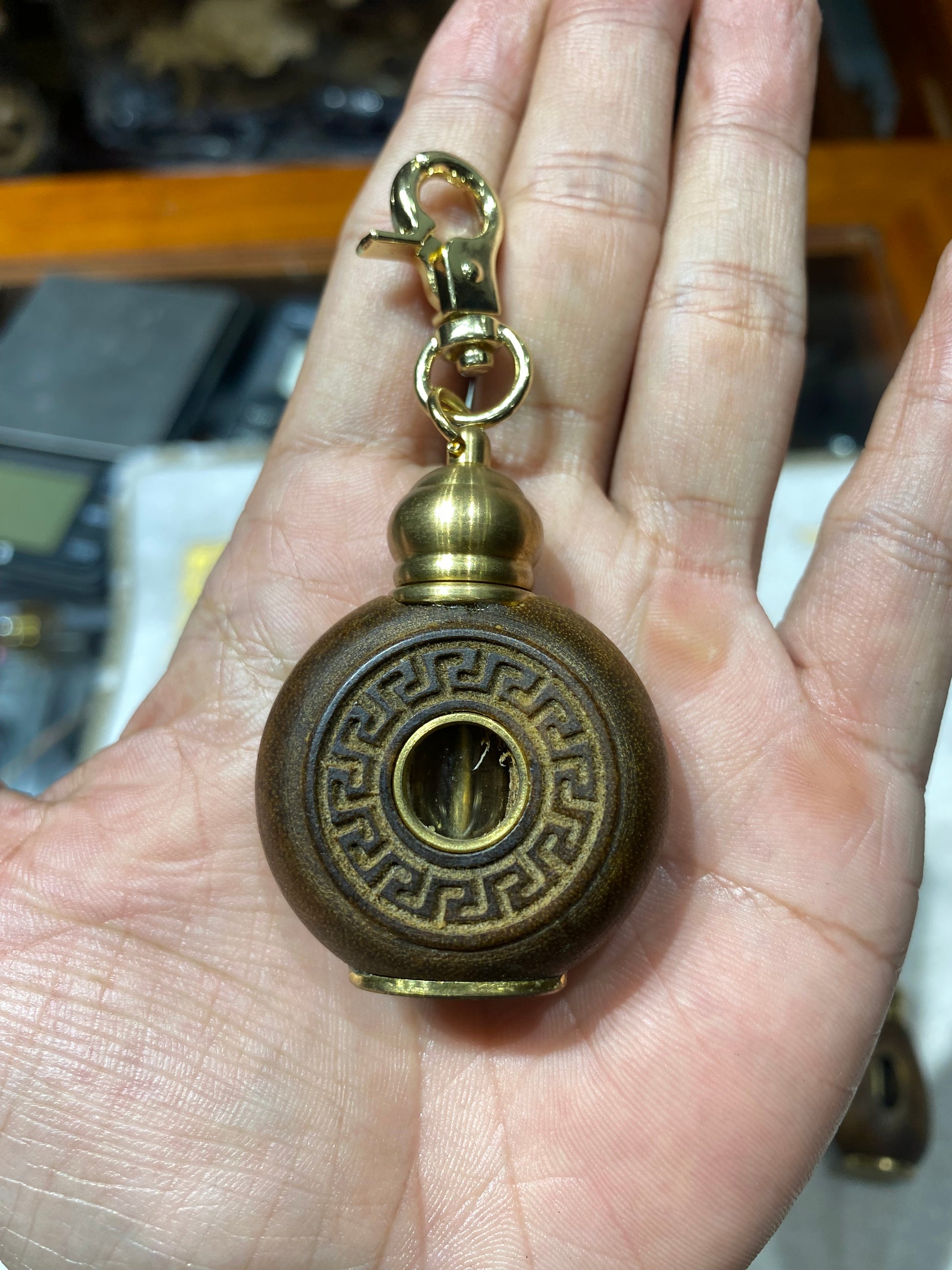 keychain or a small agarwood container made from a combination of agarwood and metal. It is commonly used to store or diffuse the scent of agarwood. The design features classic symmetrical patterns, possibly inspired by Greek or traditional Eastern motifs, symbolizing eternity, protection, and balance.