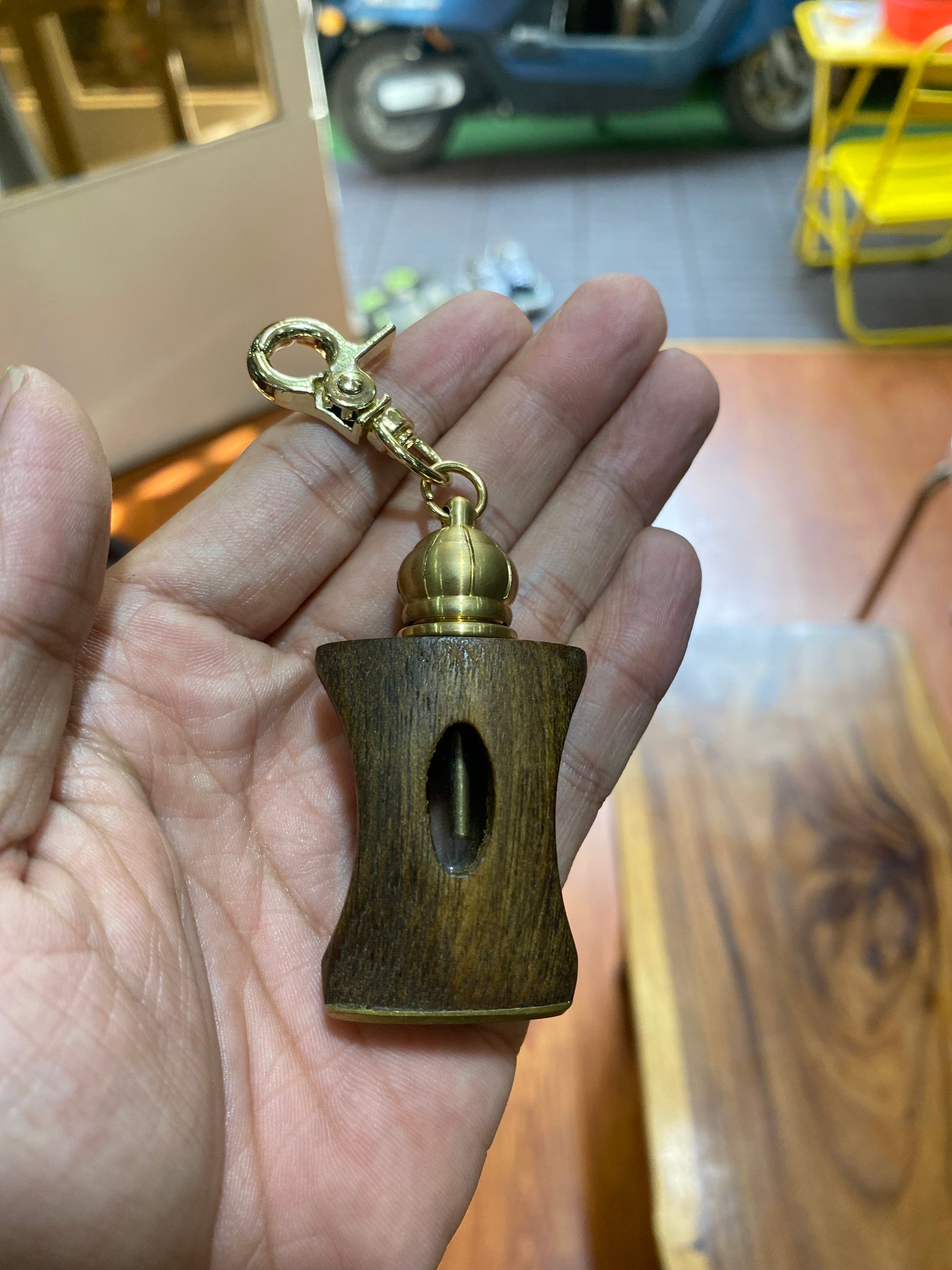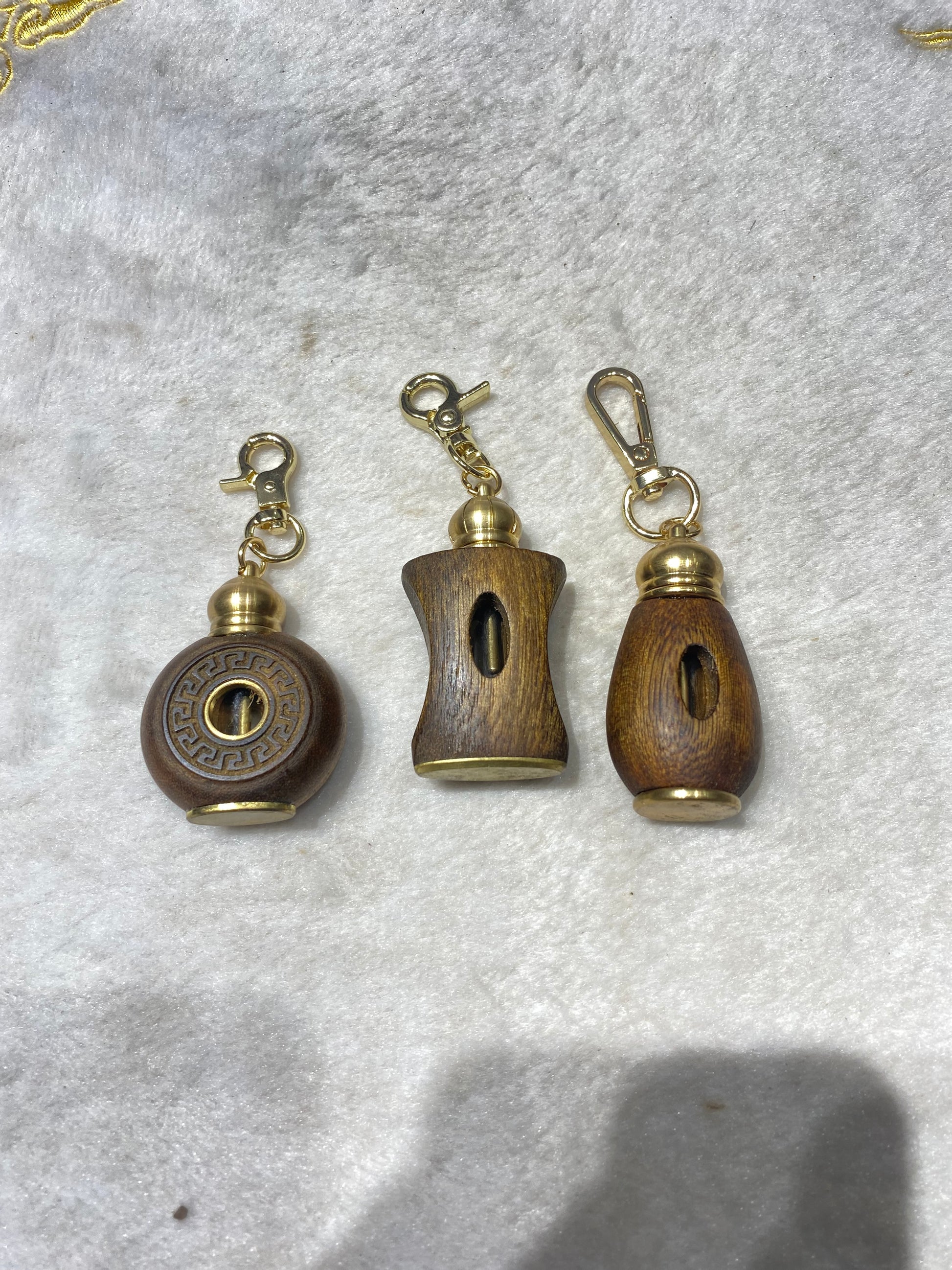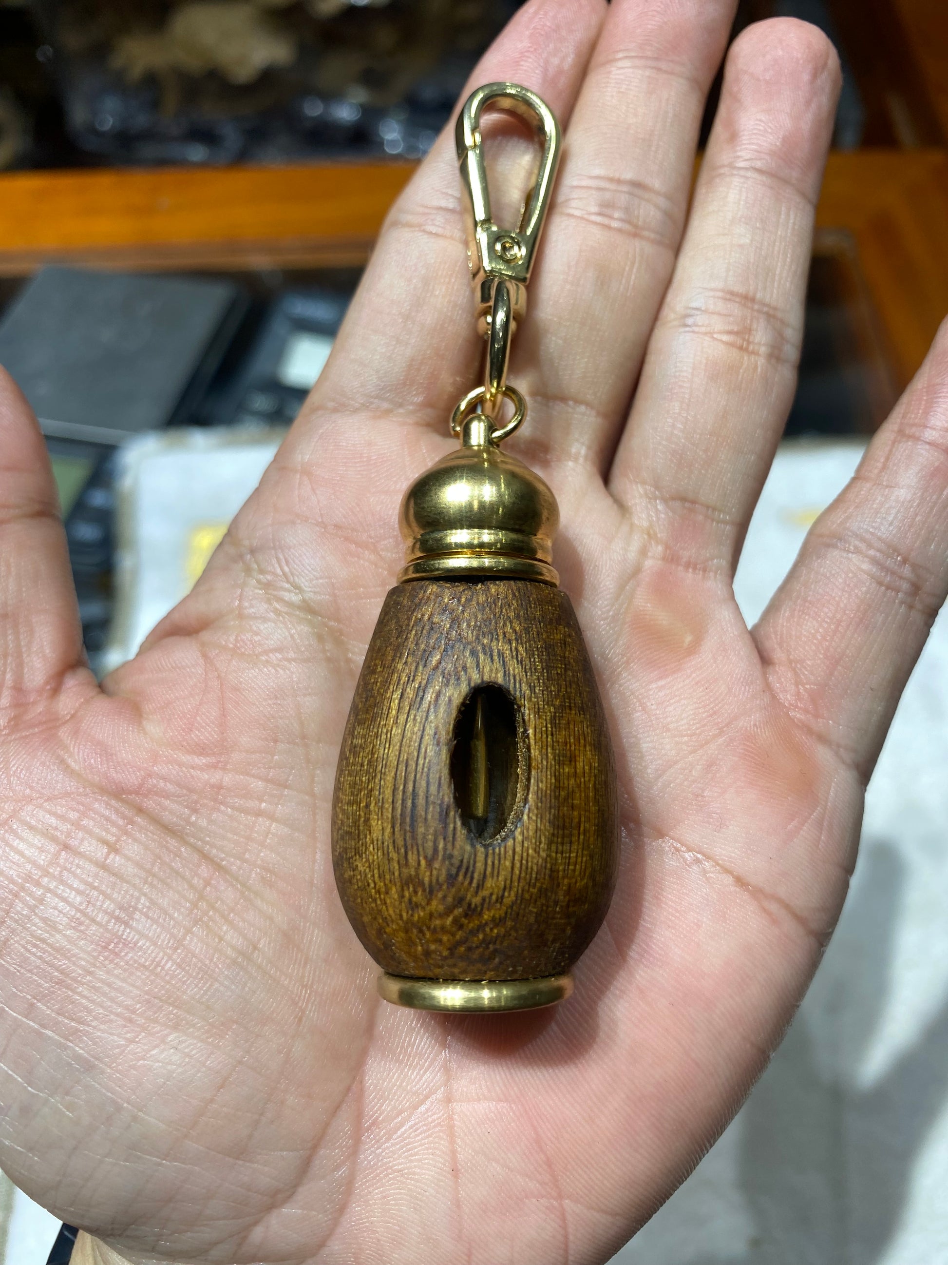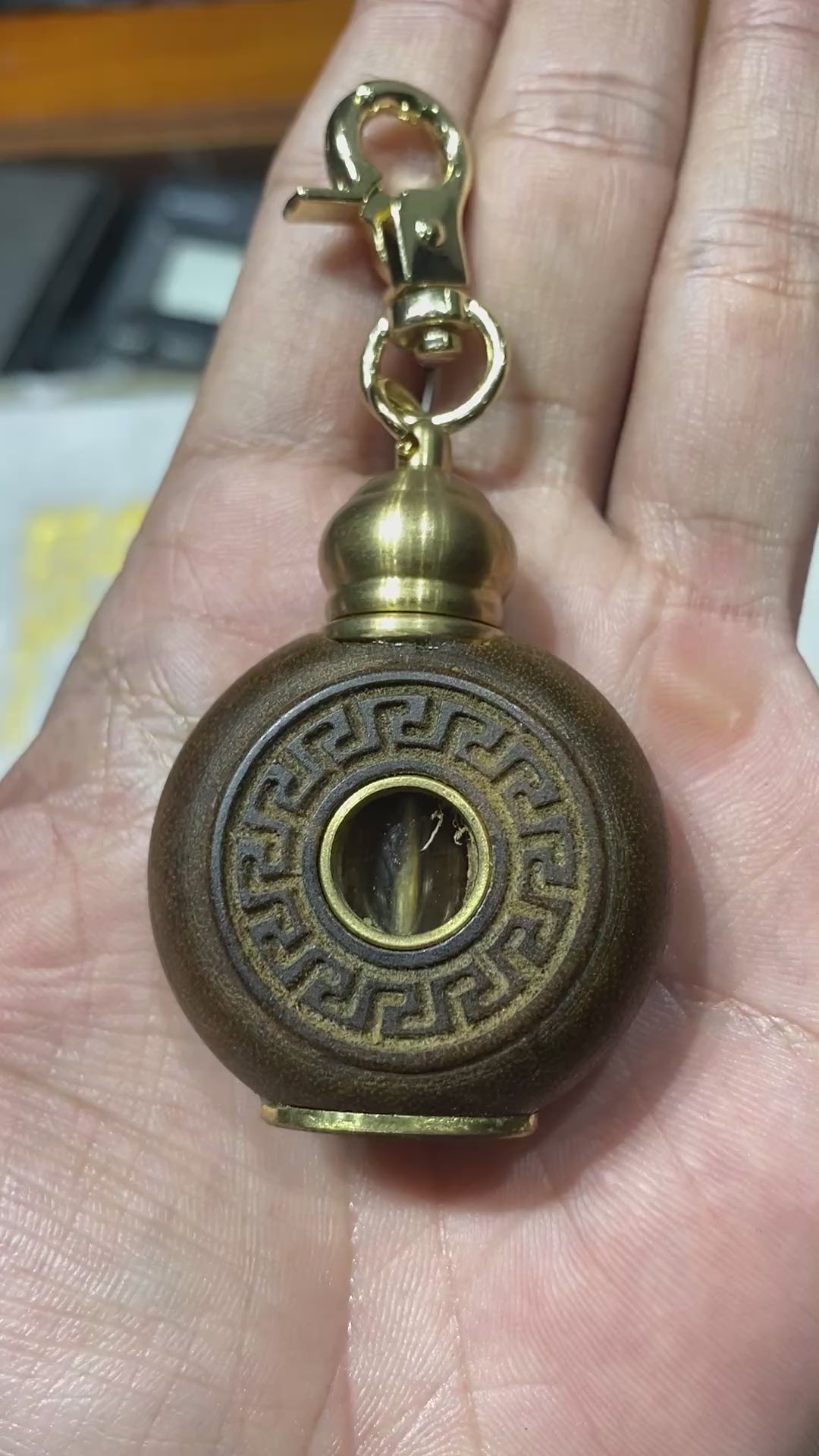 keychain or a small agarwood container made from a combination of agarwood and metal. It is commonly used to store or diffuse the scent of agarwood. The design features classic symmetrical patterns, possibly inspired by Greek or traditional Eastern motifs, symbolizing eternity, protection, and balance.